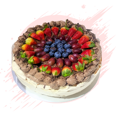 Pavlova meringue, chocolate flavour cream & chopped chocolate. Top with berries fruits. 10 inch can cut into 10-12 slices.
