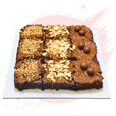 Nutella brownies whole size 8inch cut into small 9pcs with nutella & toppings. Small pieces size around 2.5inch x 2.5inch each.